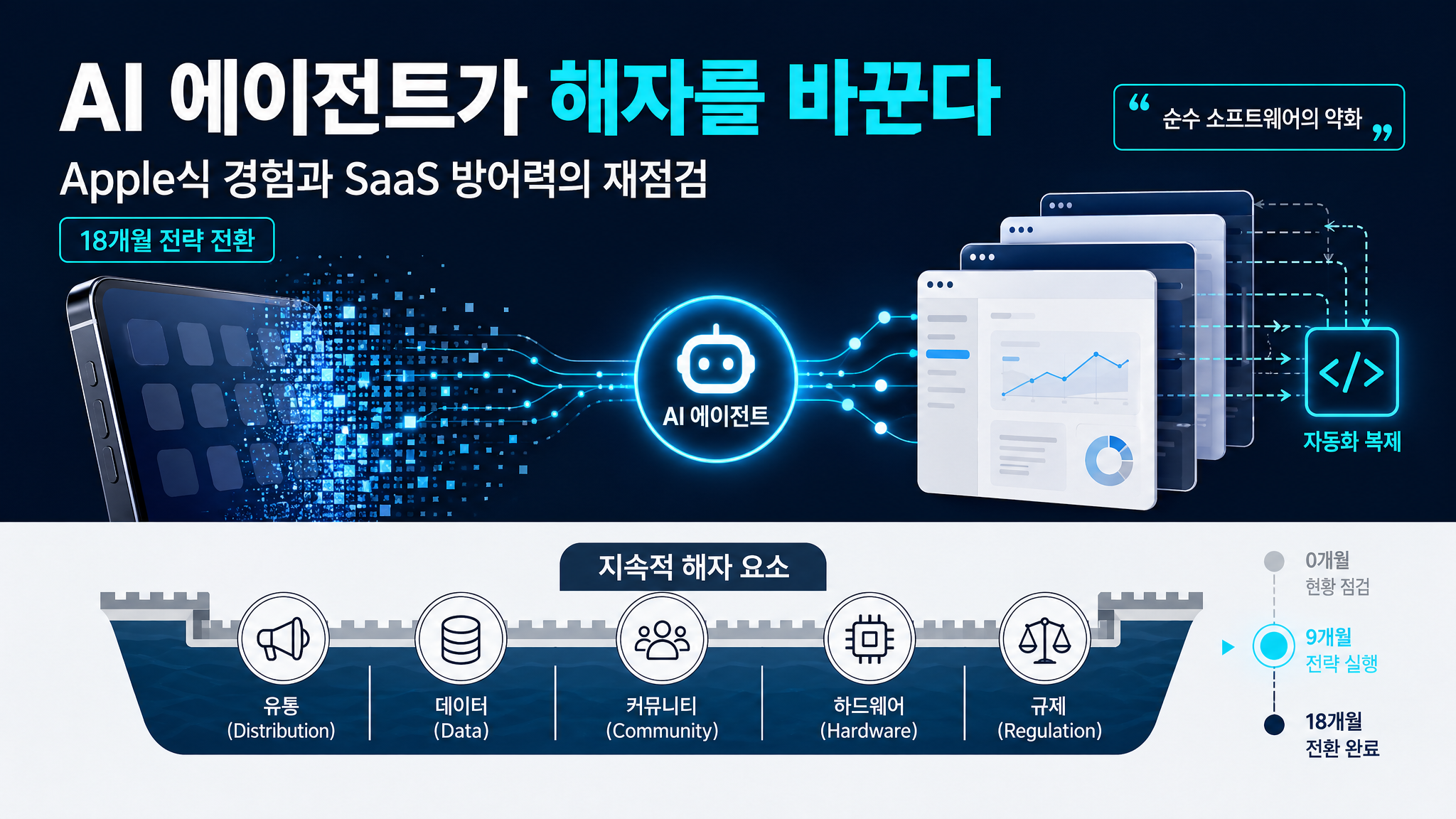 저자는 세 번째 선택지를 권합니다. 즉, 현재 사업의 해자가 무엇인지 냉정하게 점검하고, AI가 복제하기 어려운 유통·커뮤니티·데이터·하드웨어·산업 전문성 같은 방어력을 구축해야 한다는 주장입니다. 핵심은 먼 미래가 아니라 이번 분기부터 실제 전략을 바꾸는 것입니다.